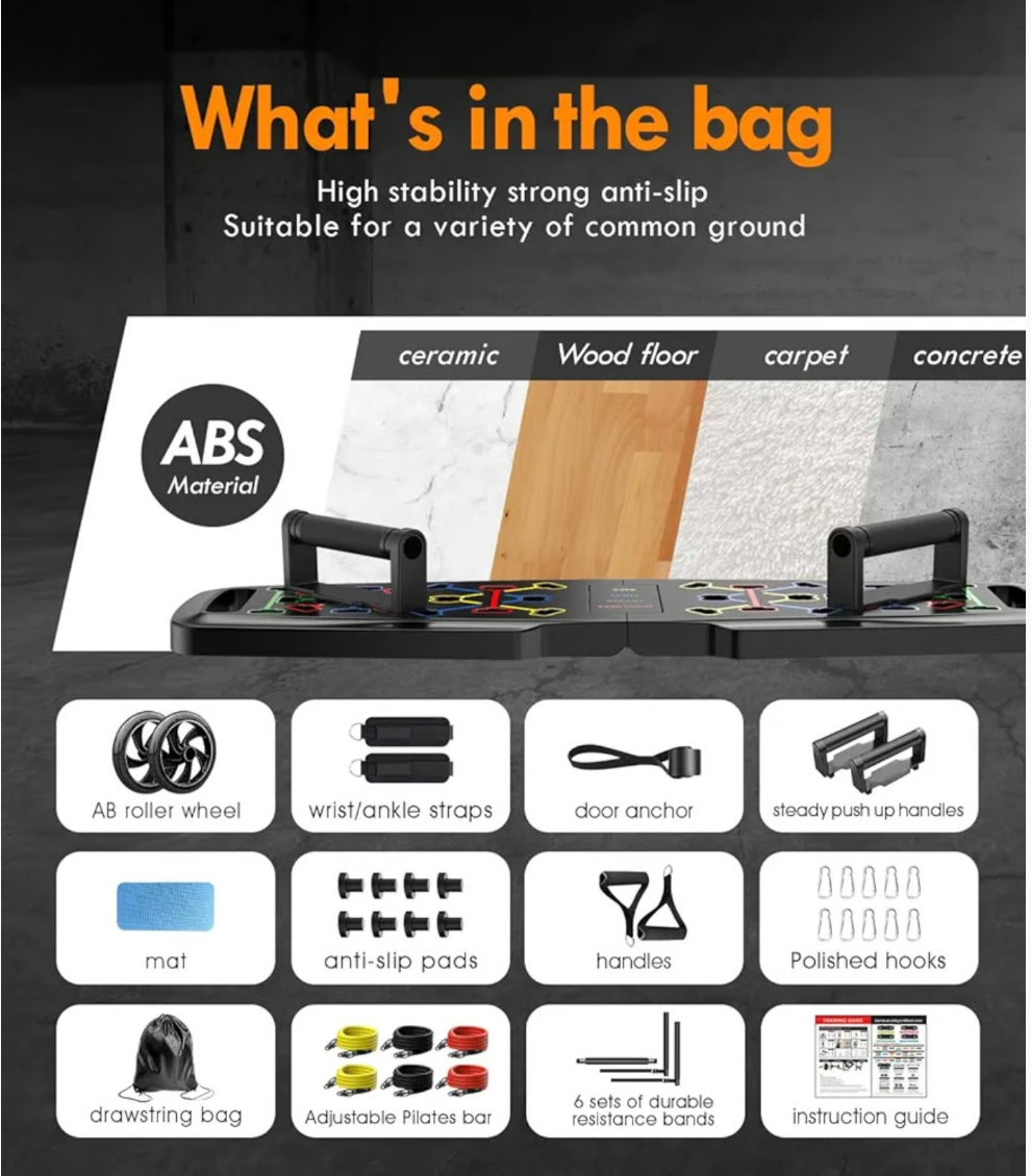 【Fitness System for Anyone】Versatile home portable fitness device Weve kept the professional push up straining Added foldable fitness bars and wrist/ankle straps Ab roller wheel and 6 resistance bands so You can perform more exercises. Light but stable enough. You can choose the intensity according to your ability.